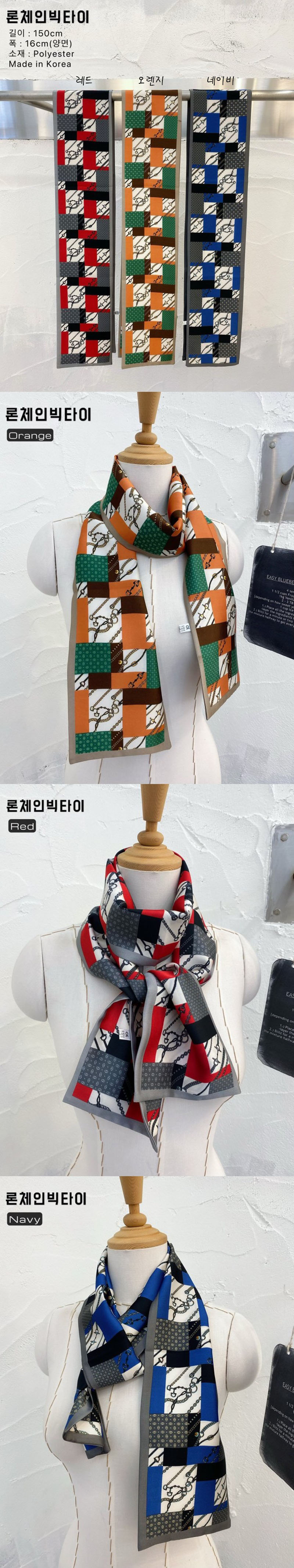 여성 간절기 체인 양면 미니 쁘띠 방도 스카프색상 : 오렌지,레드,네이비사이즈 : 16 , 150cm소재 : 폴리