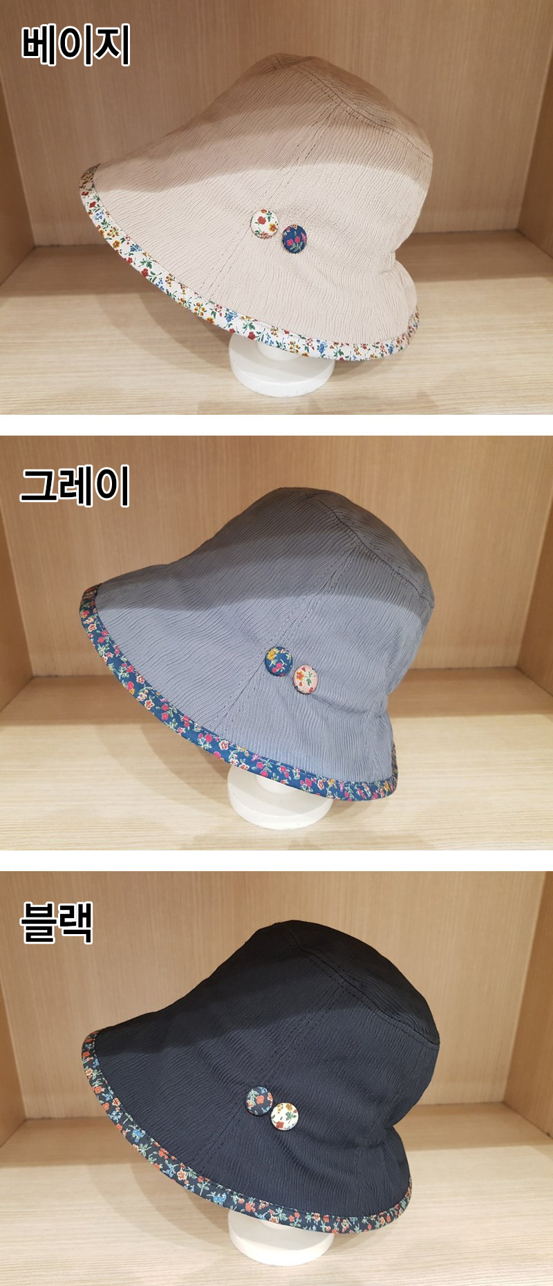엠보 여성 단추 포인트 버킷햇 벙거지 모자색상:베이지,그레이,블랙사이즈 : 프리cm소재 : 면,폴리