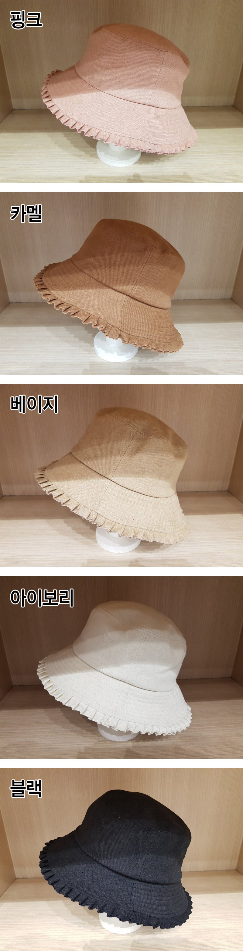 프릴 여성 가을 버킷햇 벙거지 모자 캠핑색상:핑크,베이지,카멜,아이보리,블랙사이즈 : 프리cm소재 : 면,폴리