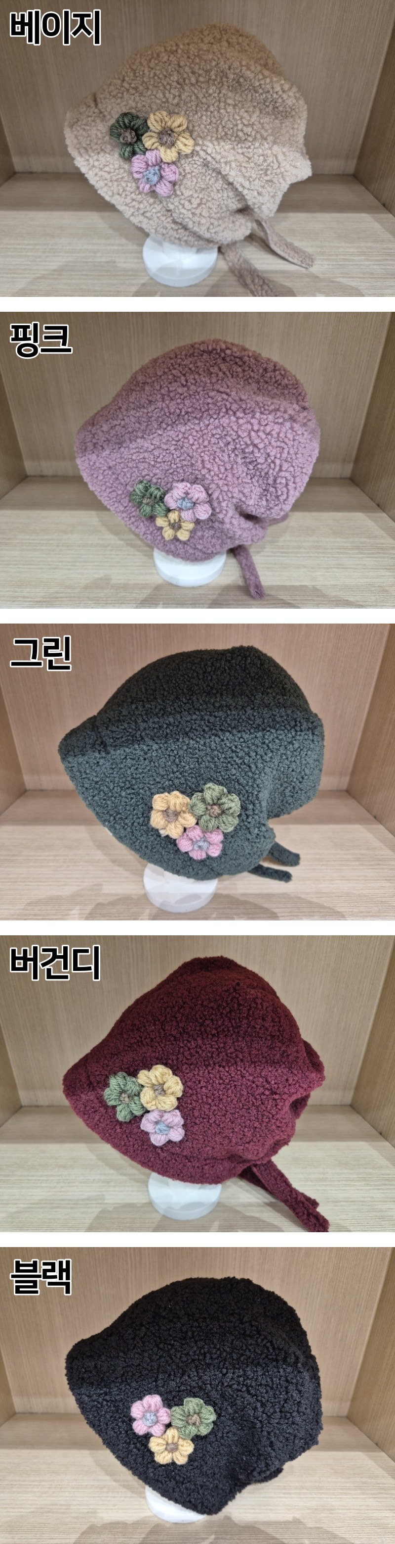 뽀글이 털 코사지 끈 비니 실내 모자 두건색상:베이지,핑크,그린,버건디,블랙사이즈 : 0cm소재 : 아크릴,폴리