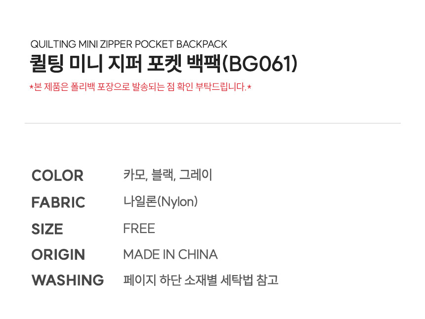 퀼팅 미니 지퍼 포켓 백팩 (BG061)