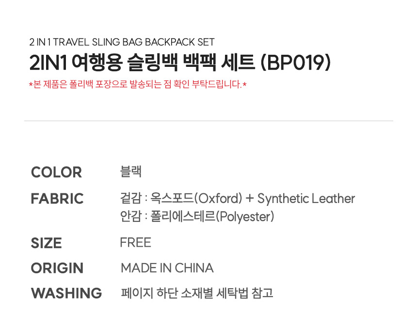 2in1 여행용 슬링백 백팩 세트 (BP019)