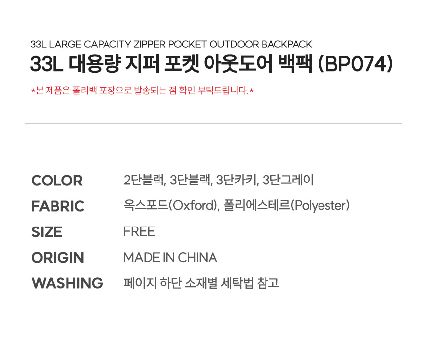 33L 대용량 지퍼 포켓 아웃도어 백팩 (BP074)