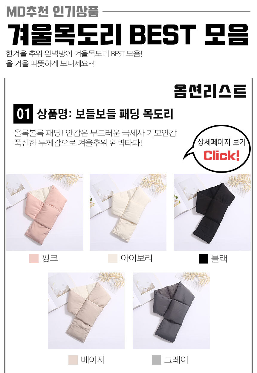 물량확보/당일출고 기모안감 패딩목도리 남녀공용 겨울 경량 패딩머플러 남자 여자 방한 넥워머 남성 여성