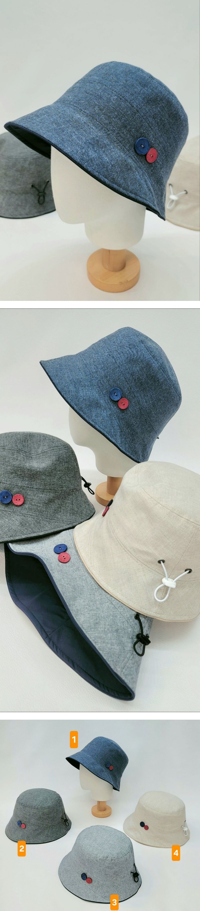 국산 단추 봄 여름 버킷햇 보넷 모자색상 : 1,2,3,4사이즈 : 소재 : 폴리*사이즈는 재는 방식에 따라 2~3cm내외의 오차가 있을수 있습니다.
