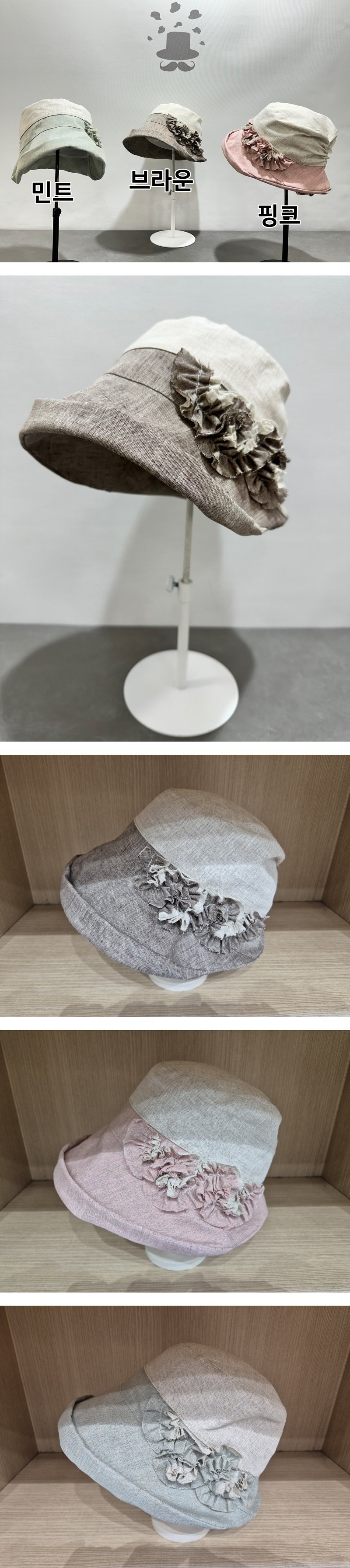 린넨 투톤 프릴 벙거지 모자 중년 여성 간절기색상 : 브라운,핑크,민트사이즈 : 0소재 : 린넨,폴리*사이즈는 재는 방식에 따라 2~3cm내외의 오차가 있을수 있습니다.