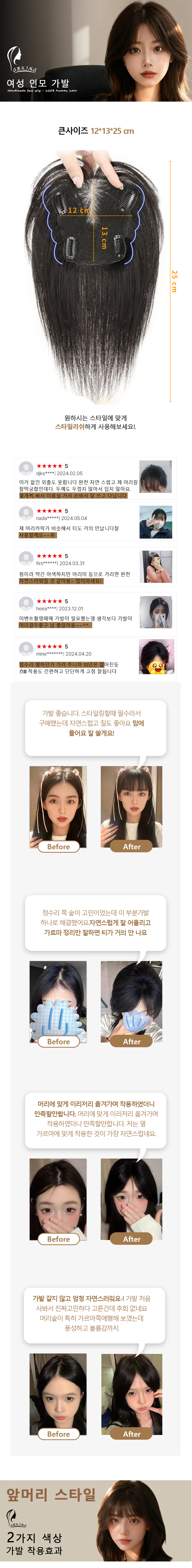지비킹 정수리 앞머리 가르마 수제 부분가발 인모 100% 큰사이즈