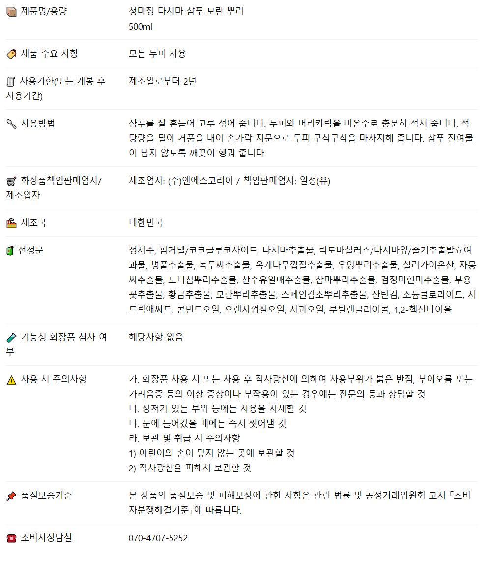 청미정 다시마 샴푸 성분 천재 모란 뿌리 500ml