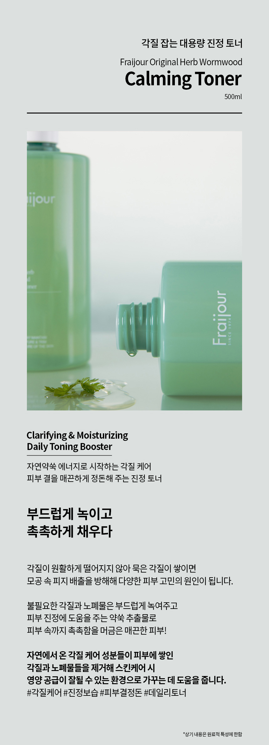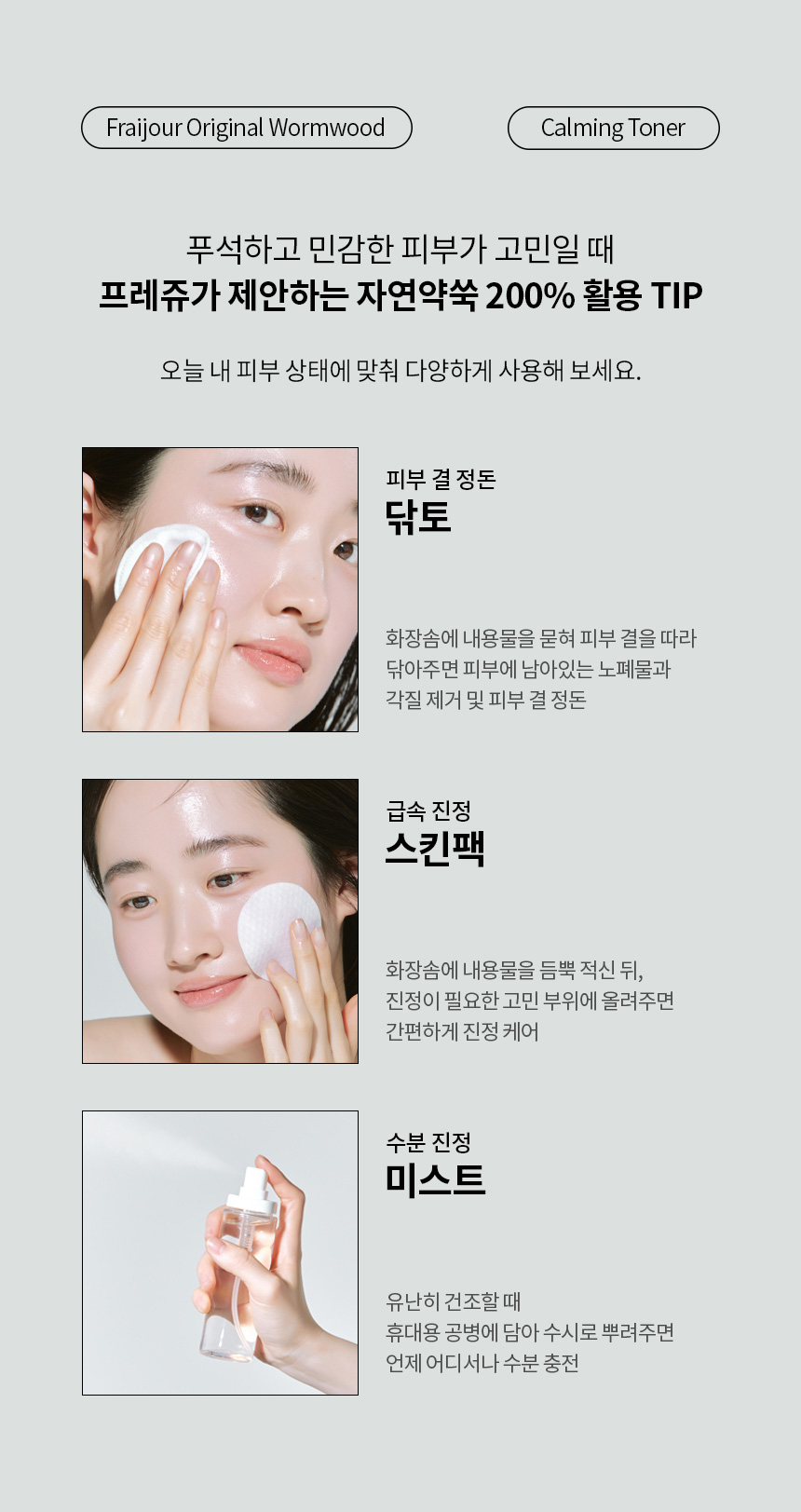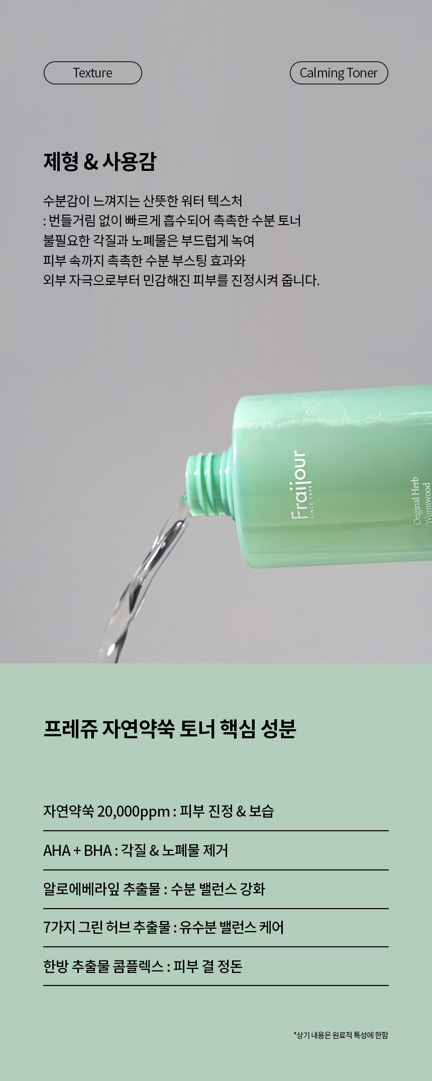 | 화장품법에 따라 기재/ 표시하여야 하는 모든 성분 | 정제수, 메칠프로판디올, 글리세린, 애엽(약쑥)추출물(2000mg/100ml), 베타인, 글리세레스-26, 소듐시트레이트, 피이지-60하이드로제네이티드캐스터오일, 폴리소르베이트80, 알로에베라잎추출물, 소듐하이알루로네이트, 시트릭애씨드, 글라이콜릭애씨드, 락틱애씨드, 살리실릭애씨드, 블랙베리추출물, 블루베리추출물, 라즈베리추출물, 아사이야자추출물, 감초추출물, 감나무잎추출물, 상백피추출물, 백년초열매추출물, 브로콜리추출물, 자주개자리추출물, 양배추잎추출물, 밀배아추출물, 서양유채추출물, 무씨추출물, 의이인추출물, 밀추출물, 옥수수커넬추출물, 녹두추출물, 검정콩추출물, 쌀겨추출물, 쟈스민꽃/잎추출물, 로즈마리잎추출물, 라벤더꽃/잎/줄기추출물, 위치하젤껍질/잎/잔가지추출물, 유칼립투스잎추출물, 카렌둘라꽃추출물, 페퍼민트잎추출물, 마편초추출물, 캐모마일꽃추출물, 루이보스추출물, 병풀추출물, 녹차추출물, 갈락토미세스발효여과물, 편백나무잎추출물, 소나무잎추출물, 구주소나무싹추출물, 파파야열매추출물, 1,2-헥산디올, 1,3-프로판디올, 카프릴릴글라이콜, 팔각회향추출물, 페녹시에탄올, 디소듐이디티에이, 디포타슘글리시리제이트, 향료 |