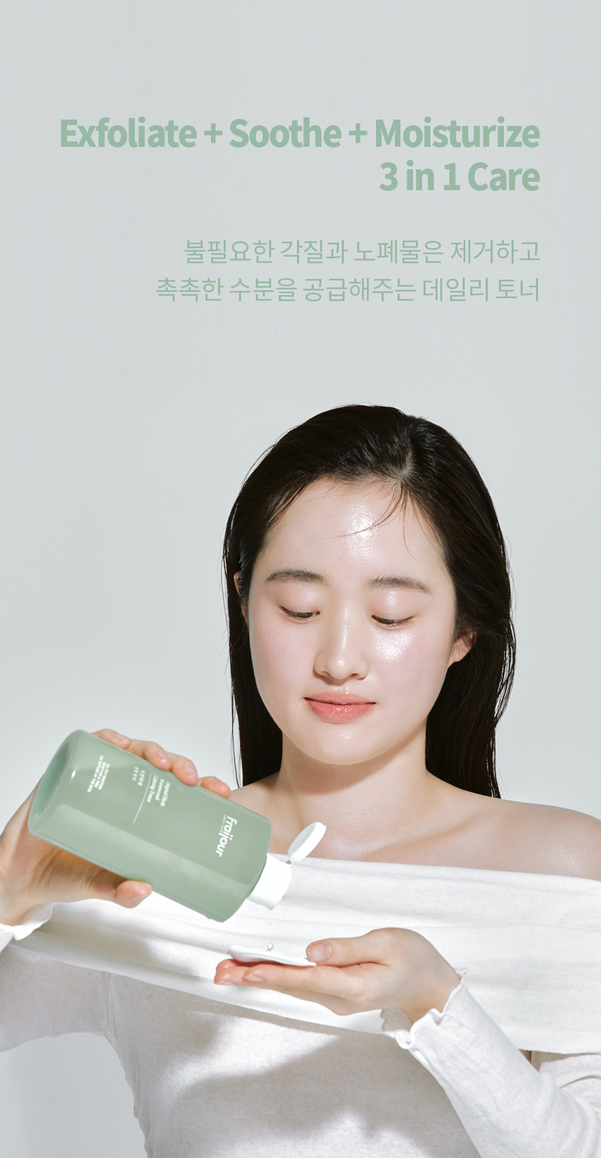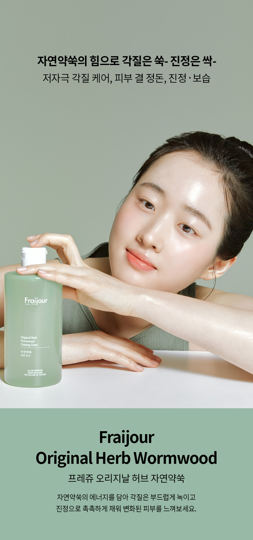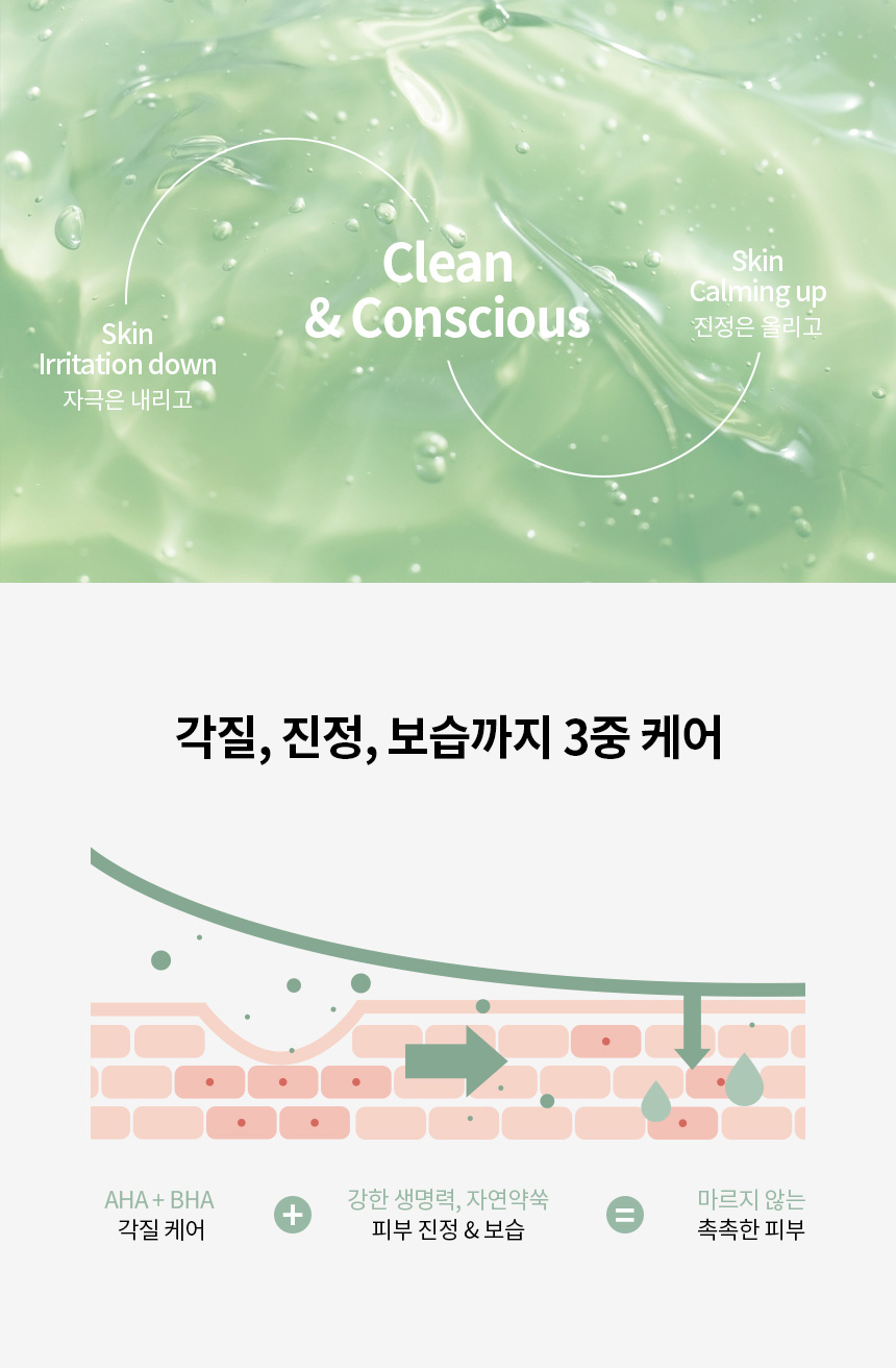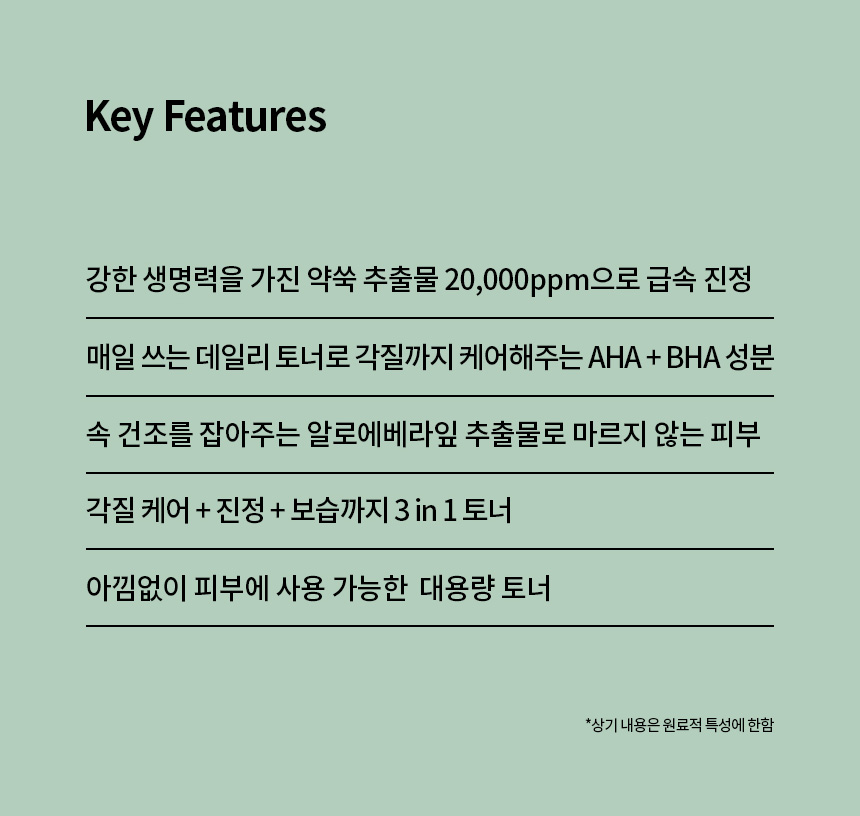 | 화장품법에 따라 기재/ 표시하여야 하는 모든 성분 | 정제수, 메칠프로판디올, 글리세린, 애엽(약쑥)추출물(2000mg/100ml), 베타인, 글리세레스-26, 소듐시트레이트, 피이지-60하이드로제네이티드캐스터오일, 폴리소르베이트80, 알로에베라잎추출물, 소듐하이알루로네이트, 시트릭애씨드, 글라이콜릭애씨드, 락틱애씨드, 살리실릭애씨드, 블랙베리추출물, 블루베리추출물, 라즈베리추출물, 아사이야자추출물, 감초추출물, 감나무잎추출물, 상백피추출물, 백년초열매추출물, 브로콜리추출물, 자주개자리추출물, 양배추잎추출물, 밀배아추출물, 서양유채추출물, 무씨추출물, 의이인추출물, 밀추출물, 옥수수커넬추출물, 녹두추출물, 검정콩추출물, 쌀겨추출물, 쟈스민꽃/잎추출물, 로즈마리잎추출물, 라벤더꽃/잎/줄기추출물, 위치하젤껍질/잎/잔가지추출물, 유칼립투스잎추출물, 카렌둘라꽃추출물, 페퍼민트잎추출물, 마편초추출물, 캐모마일꽃추출물, 루이보스추출물, 병풀추출물, 녹차추출물, 갈락토미세스발효여과물, 편백나무잎추출물, 소나무잎추출물, 구주소나무싹추출물, 파파야열매추출물, 1,2-헥산디올, 1,3-프로판디올, 카프릴릴글라이콜, 팔각회향추출물, 페녹시에탄올, 디소듐이디티에이, 디포타슘글리시리제이트, 향료 |