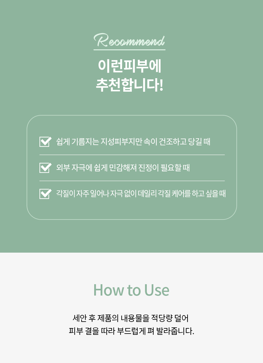 | 사용방법 | 세안후, 화장솜에 토너를 적당량 묻힌 후, 피부결에 따라 닦아내줍니다. |