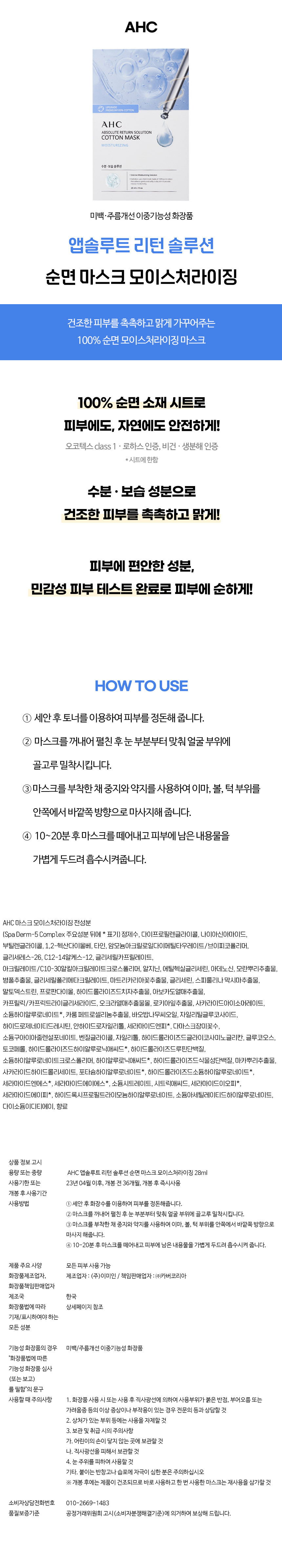 AHC 순면 마스크팩 앱솔루트 리턴 모이스처라이징 10매