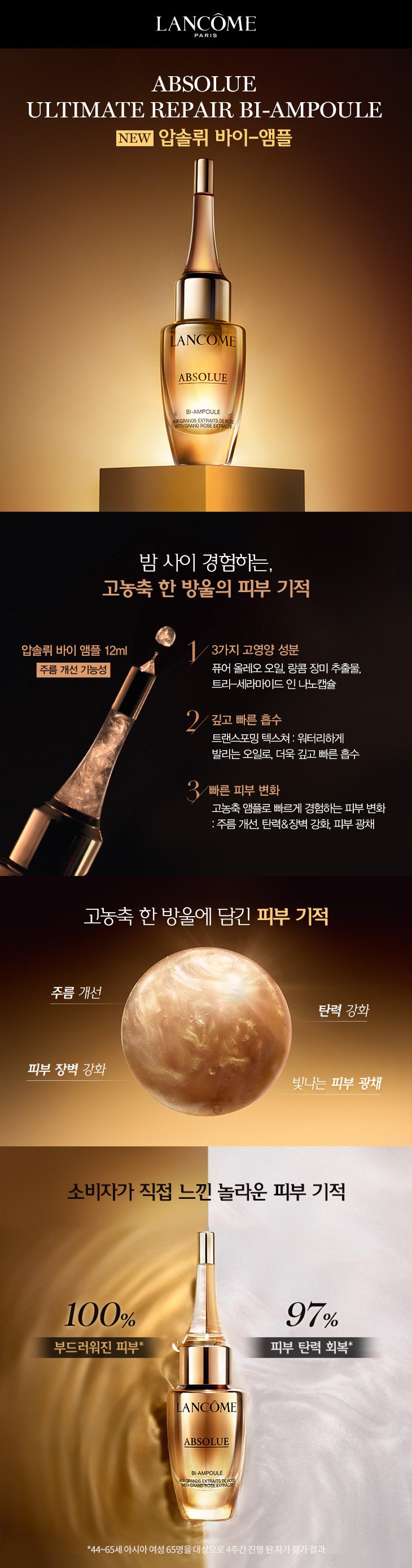 압솔뤼 바이 앰플 [본품]압솔뤼 바이 앰플 12ml밤 사이 경험하는, 고농축 한 방울의 피부 기적.3가지 진귀한 영양 성분이 트랜스포밍 텍스처로 더욱 깊고 빠르게 피부에 흡수 되어, 밤 사이 놀라운 피부 기적을 선사하는 고농축 앰플[주름개선 기능성 승인]