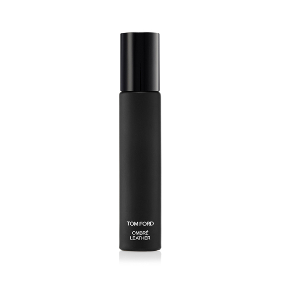 클러치 사이즈의 매끄러운 블랙 유리보틀에 고급스럽게 패키징된 옴프레 레더 트래블 스프레이 입니다.