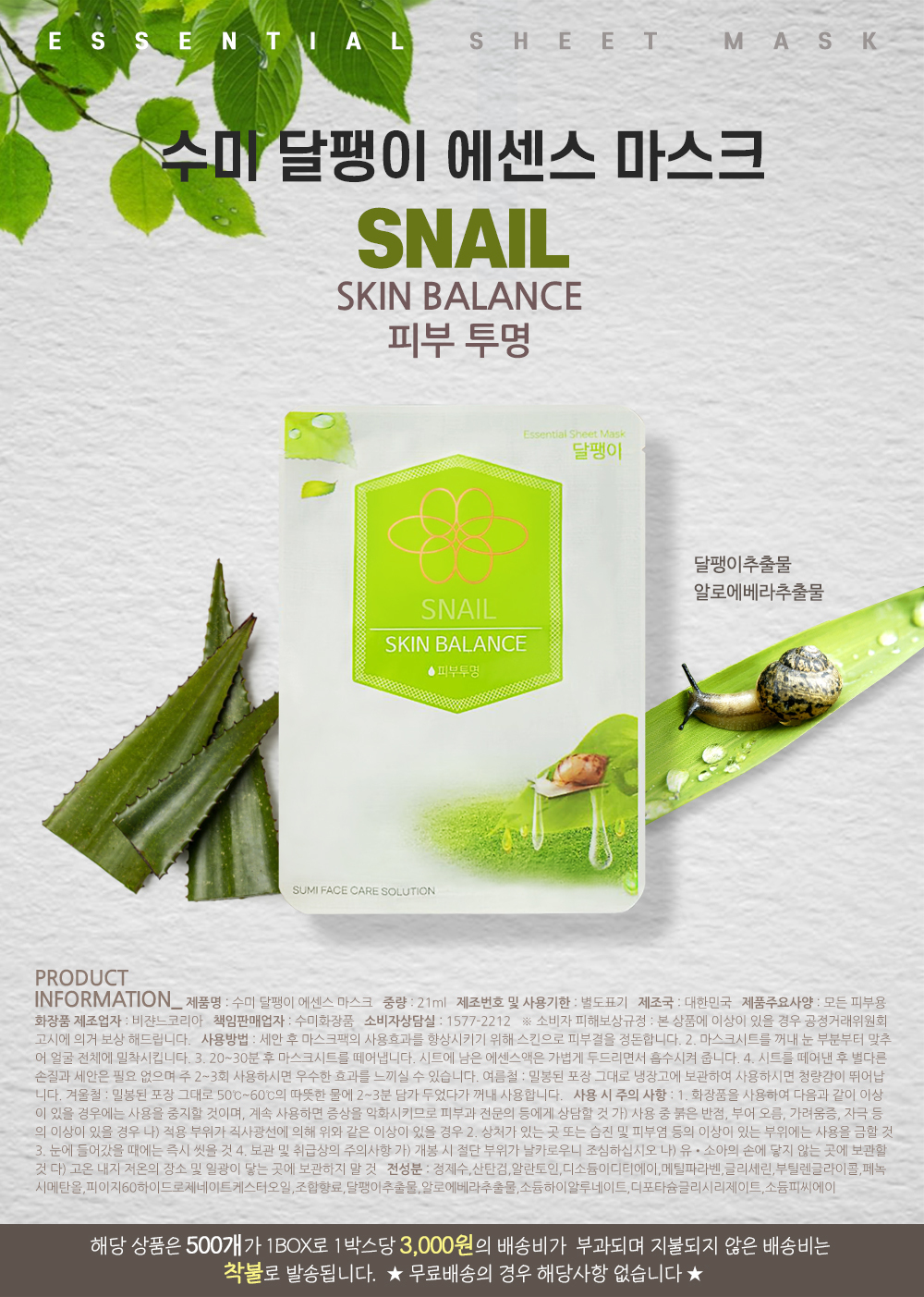 수미 달팽이 에센스 시트 마스크팩 21ml x 100개 수분 진정 미백 마스크