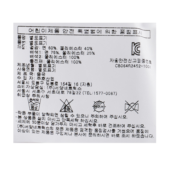 소 재.......겉감-면60%,폴리에스터40% / 배색1-면75%, 폴리에스터25% / 배색2-폴리에스터100% / 충전재-폴리 에스터100%