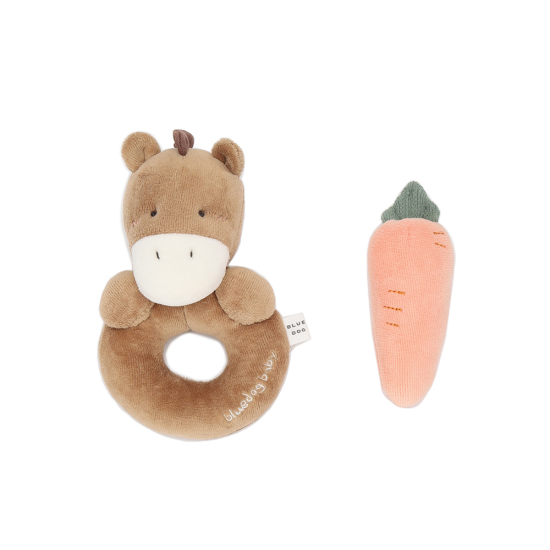 말띠해를 맞아 귀여운 말캐릭터와 당근인형으로 구성된 딸랑이 인형 세트 입니다.