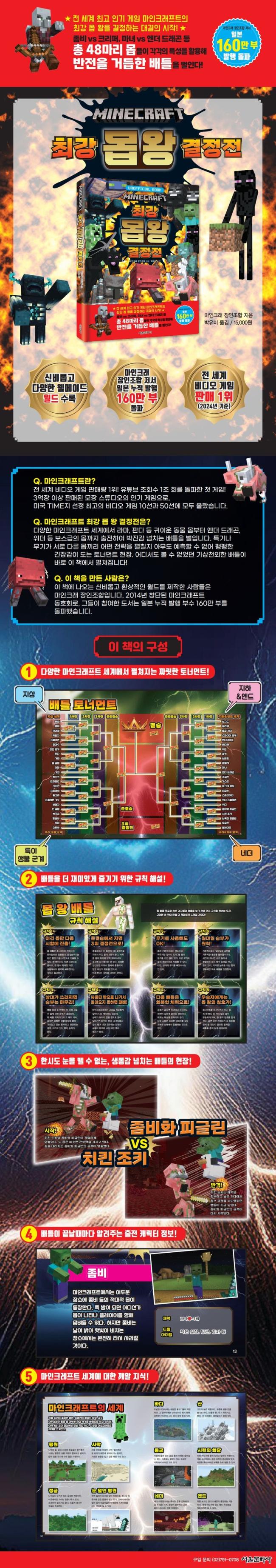 총 48마리의 몹들이 마인크래프트 최강의 자리를 노리며 토너먼트 형식의 배틀을 벌이기 시작합니다. 제각각의 특성을 활용한 화려한 싸움과, 반전의 반전을 거듭한 전개가 펼쳐지는 뜨거운 싸움에 주목해 보세요! 어느 쪽이 이길지 아무도 모르는 치열한 전투 속에서, 과연 최강 몹 왕의 칭호를 얻게 되는 몹은 누구일까요? 두근두근 설레는 마음으로 결승전까지 함께 응원해 봅시다!