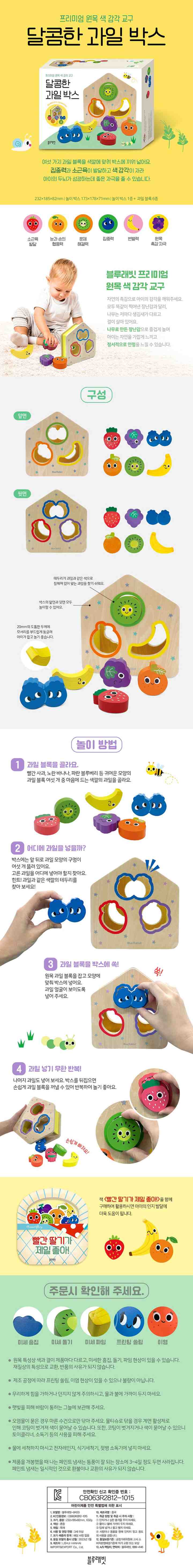 과일 박스에는 각각의 과일 모양대로 구멍이 뚫려 있고, 과일과 똑같은 색으로 테두리가 칠해져 있어요. 테두리의 색깔에 맞춰 빨간 딸기, 노란 바나나 등 여섯 가지 과일 블록을 박스에 끼워 넣어요. 어떤 과일인지 찾아 블록을 맞추다 보면 집중력과 소근육이 발달하고 색 감각이 자라 아이의 두뇌가 성장하는데 좋은 자극을 줄 수 있습니다.