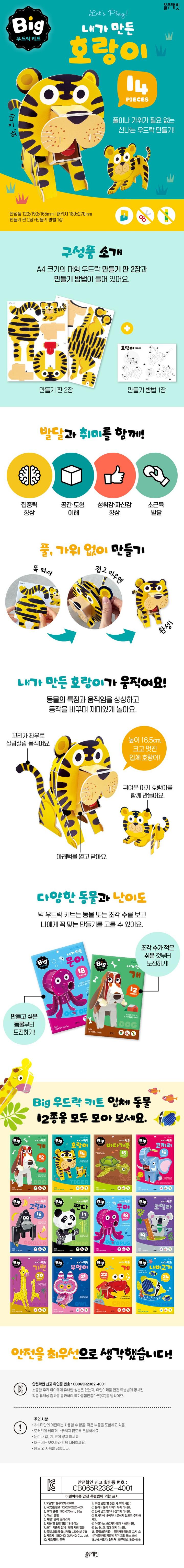〈빅 우드락 키트〉의 입체 동물은 특징이 되는 부분을 움직일 수 있도록 설계했어요. ‘내가 만든 호랑이’는 아래턱이 움직이기 때문에 입을 벌리고 닫을 수 있어요. 또 작고 귀여운 아기 호랑이도 함께 만들 수 있답니다. ‘내가 만든 호랑이’를 여러 가지 동작으로 연출하여 가지고 놀고 인테리어 소품으로도 사용하세요.