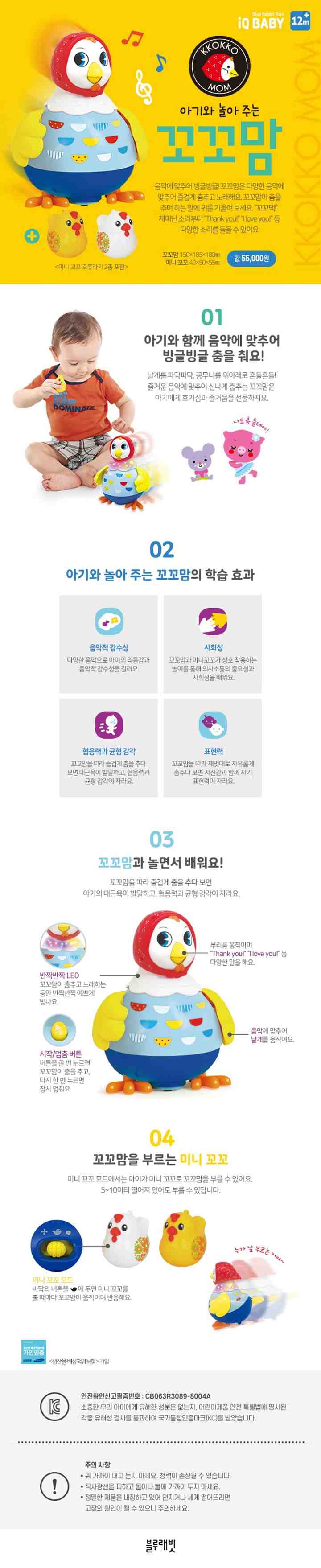 꼬꼬맘이 춤추고 노래하는 동안 빨강, 파랑, 노랑, 초록, 주황, 분홍 등 예쁘게 반짝반짝 빛나는 LED 불빛은 아이의 시선을 사로잡는답니다.