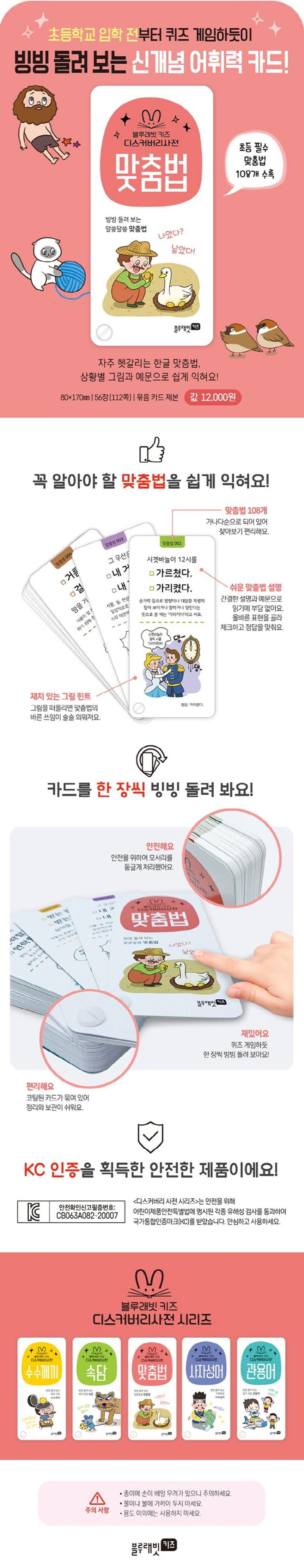 〈디스커버리 사전 맞춤법〉에는 아이들이 자주 헷갈리고 꼭 알아야 할 한글 맞춤법 108개를 그림과 함께 실어 두었어요. ‘거위가 알을 낳다/낫다.’ ‘공부를 가르치다/가리키다.’처럼 틀리기 쉬운 맞춤법들을 상황별 예문과 그림으로 익힐 수 있어요. 나들이 갈 때 차 안에서, 또는 기다리는 시간에 간편하게 한 장씩 빙빙 돌려 보면서 올바른 표현을 골라 체크하고 정답을 맞추어 보세요. 자연스레 내 어휘 실력이 나날이 좋아져요! 코팅된 56장의 맞춤법 카드는 단단히 묶여 있어서 휴대와 정리가 간편합니다.