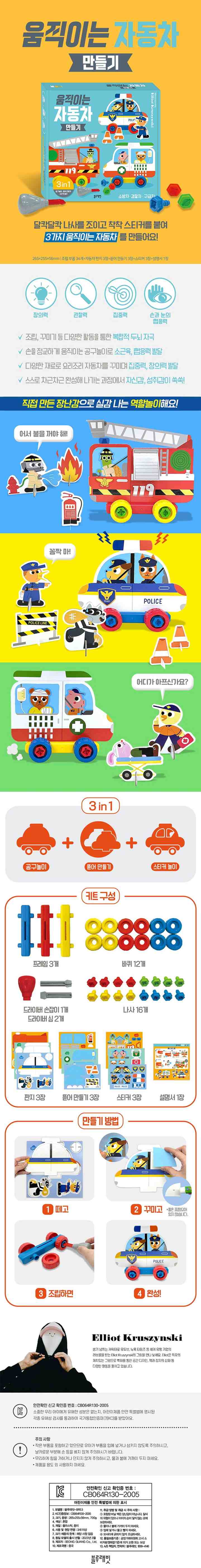 〈움직이는 자동차 만들기〉는 소중한 우리 아이에게 유해한 성분은 없는지, 어린이제품안전 특별법에 명시된 각종 유해성 검사를 통과하여 국가통합인증마크(KC)를 받았어요. 안전성이 검증된 제품으로 아이와 함께 즐겁게 놀이하세요