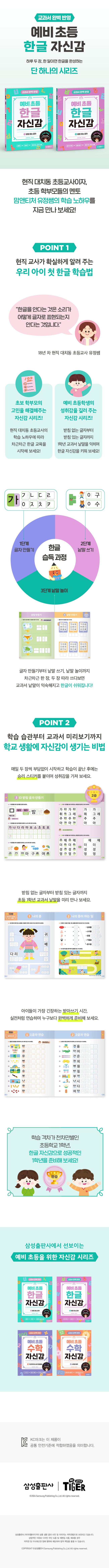 <한글 자신감>은 18년 차 현직 초등 교사 유정쌤의 학습 노하우를 담아 소리가 어떤 모양인지 배우는 단계부터 시작하여 받침 없는 쉬운 글자 쓰기로 단계별로 차근차근 구성했습니다.