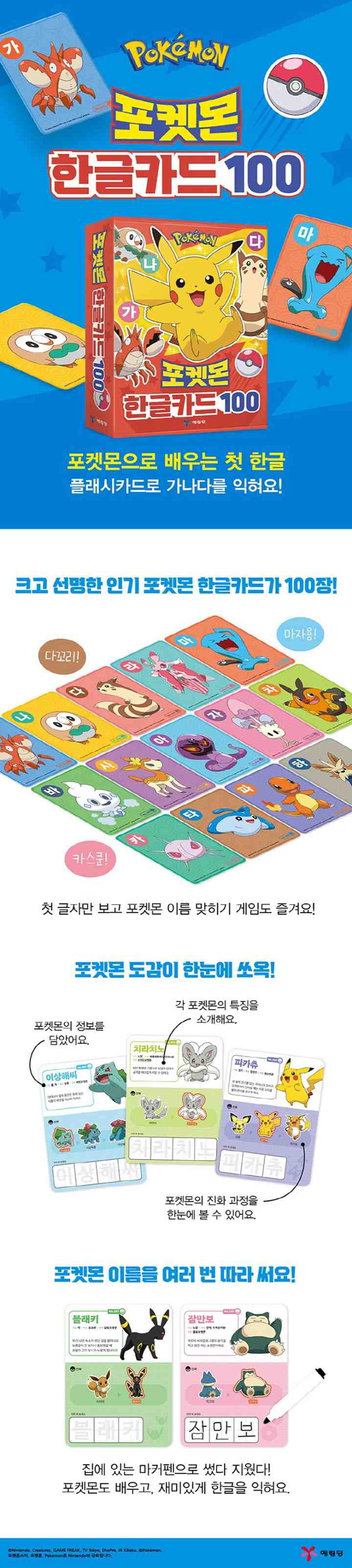 〈포켓몬 한글카드 100〉은 포켓몬으로 재미있게 한글을 배울 수 있는 플래시카드입니다. 아이들에게 인기 있는 포켓몬을 가부터 하까지 100마리 선정한 후, 카드의 앞면에 포켓몬의 선명한 이미지와 이름의 첫 글자를 표기했습니다. 포켓몬을 좋아하는 아이들은 첫 글자만 보고도 포켓몬 이름을 맞히며 신나게 놀이할 수 있습니다. 집중력이 약한 아이들에게 포켓몬의 등장은 기억력을 높여 주어 한글을 익히는 데 매우 효과적입니다. 뒷면에서는 포켓몬의 정보, 특징, 진화 과정을 한눈에 볼 수 있으며, 여기에 더해 이름을 여러 번 따라 쓸 수 있는 칸이 마련되어 있습니다. 마커펜을 이용하면 쓰고 지우고 반복할 수 있어 한글을 익히는 데 편리하게 활용할 수 있습니다. 〈포켓몬 한글카드 100〉에 수록된 100장의 포켓몬 카드를 소장하는 것만으로도 포켓몬을 좋아하는 아이들에게 큰 기쁨이 되어 줄 것입니다.