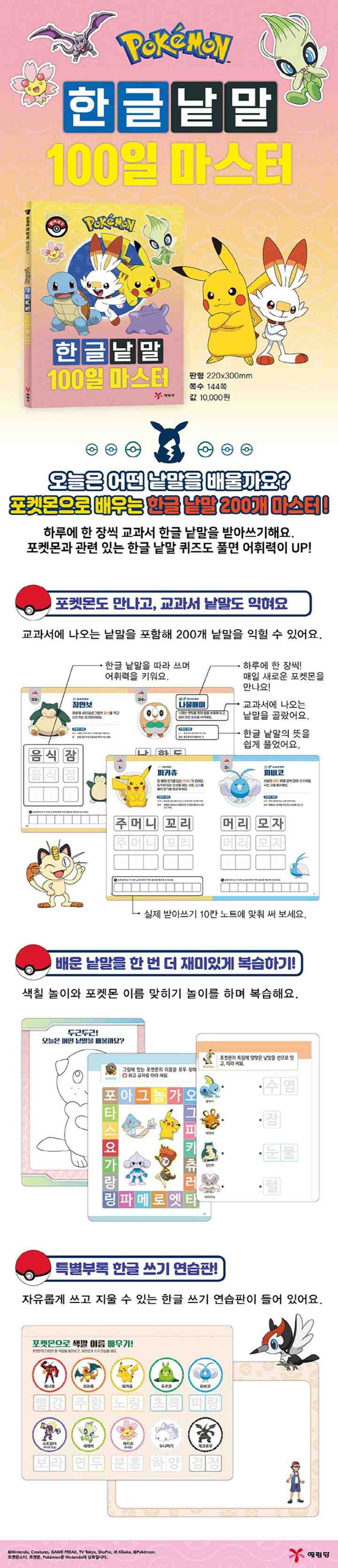 《포켓몬 한글쓰기 100일 마스터》로 한글쓰기에 자신감이 생긴 아이들을 위해 《포켓몬 한글낱말 100일 마스터》가 출시되었습니다. 아이들에게 인기 있는 포켓몬 100마리를 뽑아, 그 포켓몬들의 특징 속에서 200개의 낱말을 골랐기 때문에 포켓몬과 친근한 아이일수록 낱말의 뜻을 배우는 데 지루해하지 않고 집중할 수 있습니다. 하루에 한 장씩, 새로운 포켓몬을 만나 낱말을 익히다 보면 교과서에 나오는 낱말을 포함해 200개 낱말을 익힐 수 있습니다. 아울러 10일마다 나오는 색칠 놀이와 액티비티 활동은 한글 공부에 활력이 되어 줄 것입니다.