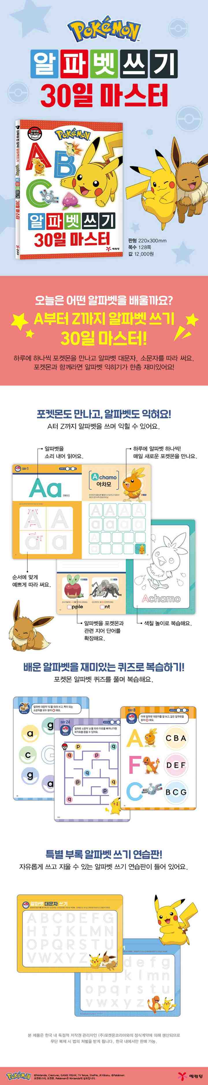 포켓몬을 만나면서 알파벳을 배우면 얼마나 즐거울까요? 포켓몬의 이름과 관련 있는 알파벳을 보면서 A부터 Z까지 대문자, 소문자를 따라 쓰는 〈포켓몬 알파벳쓰기30일 마스터〉가 출시되었습니다. 다양한 포켓몬과 함께라면 알파벳을 더욱 재미있게 익힐 수 있습니다. 또한 포켓몬과 관련 지어 단어를 확장하며 알파벳을 폭넓게 배우게 됩니다. 하루에 하나씩 알파벳을 배운 후 색칠 놀이를 통해 다시 한 번 기억하고, 배운 알파벳을 재미있는 퀴즈를 통해 복습해 보세요. 특별 부록으로 자유롭게 쓰고 지울 수 있는 알파벳 쓰기 연습판도 있어 신나게 놀이하며 알파벳에 대한 흥미와 자신감을 쑥쑥 키울 수 있습니다.