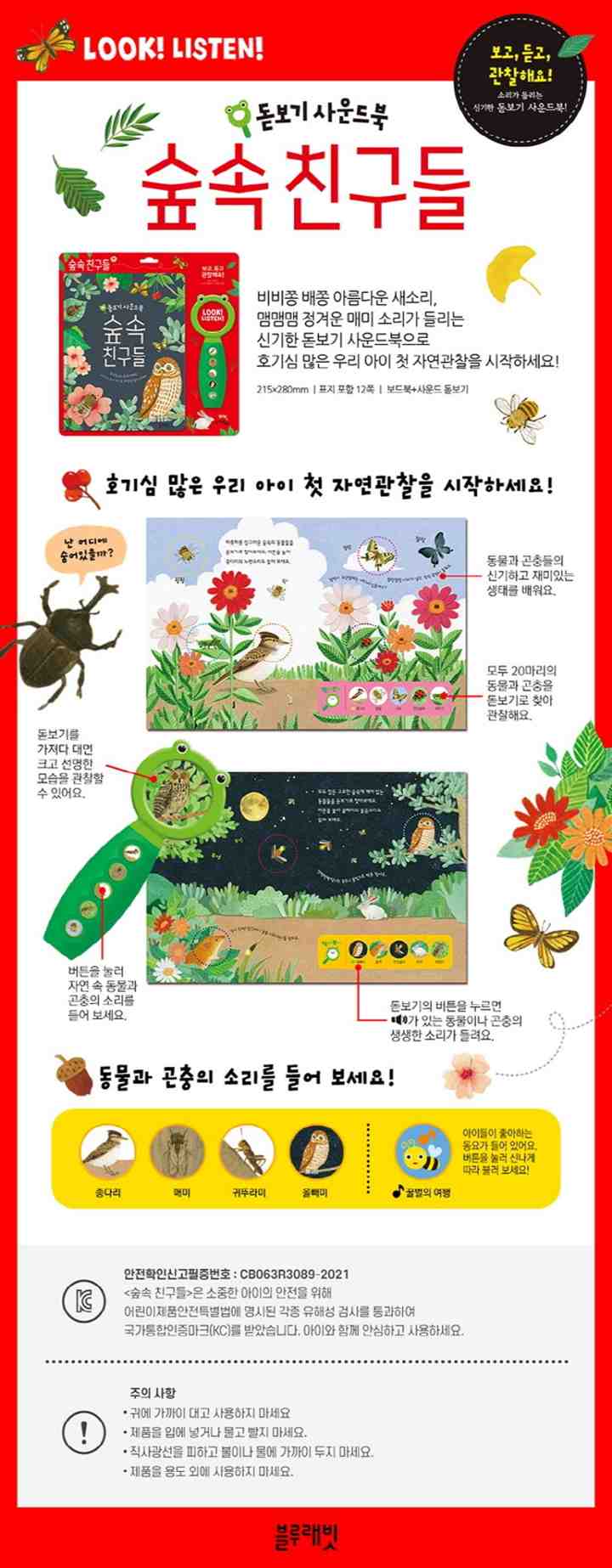 꼬물꼬물 작은 벌레들과 비비쫑 배쫑 노래하는 새들, 주변을 둘러싼 자연의 소리와 색, 계절의 변화에 호기심을 보이기 시작하는 아이에게 돋보기 사운드북 〈숲속 친구들〉을 선물해 주세요. 〈숲속 친구들〉은 자연 속 동물들의 생생한 소리를 들으며 돋보기로 관찰할 수 있어, 우리 아이들의 탐구심과 지적 호기심을 만족시켜 줄 것입니다.