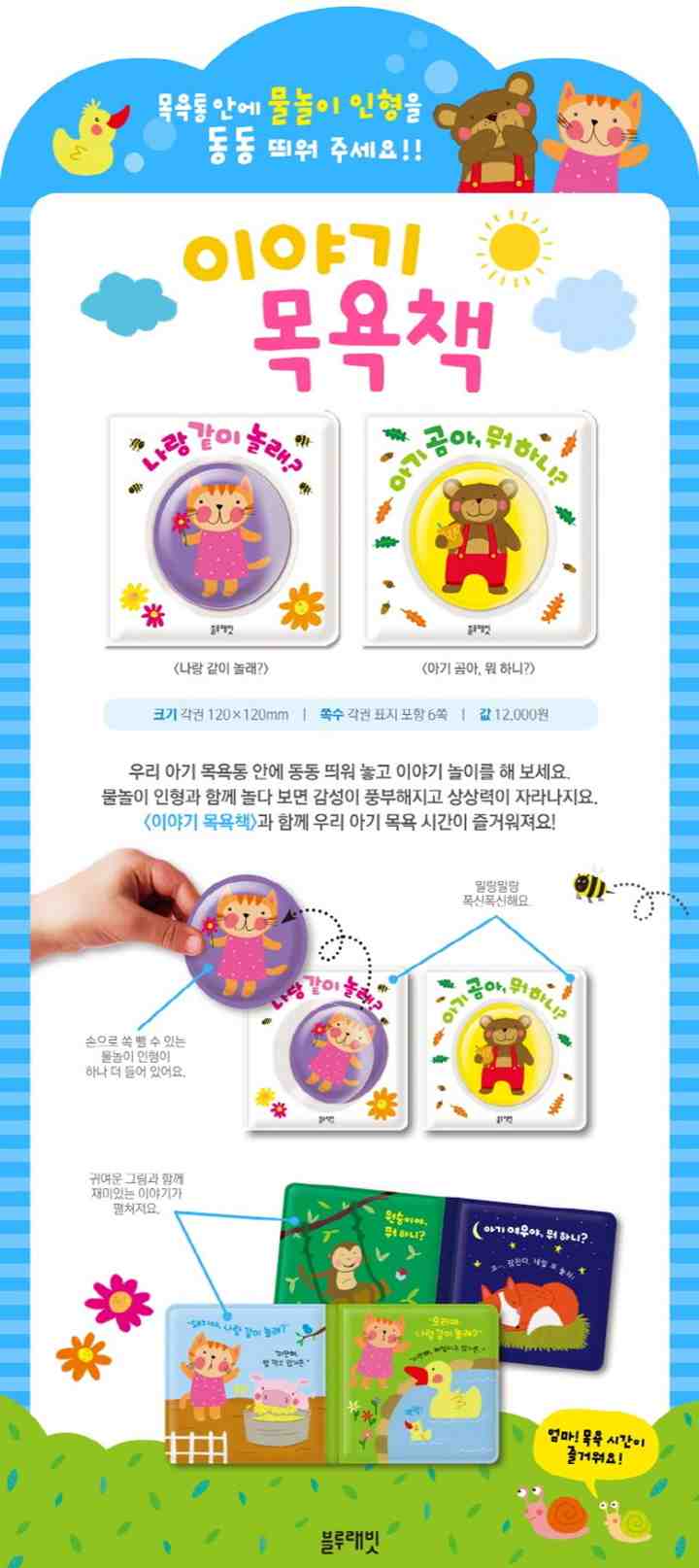 아기와 함께 목욕 시간에 재미있는 이야기 놀이를 해 보세요. 목욕통 안에 동동 띄워 놓고 놀면서 이야기를 읽어 주세요. 표지에 달린 비닐 포켓 안에는 주인공인 아기 곰과 고양이 인형이 들어 있어서 손으로 쉽게 쏙 빼내어 역할 놀이도 할 수 있지요.