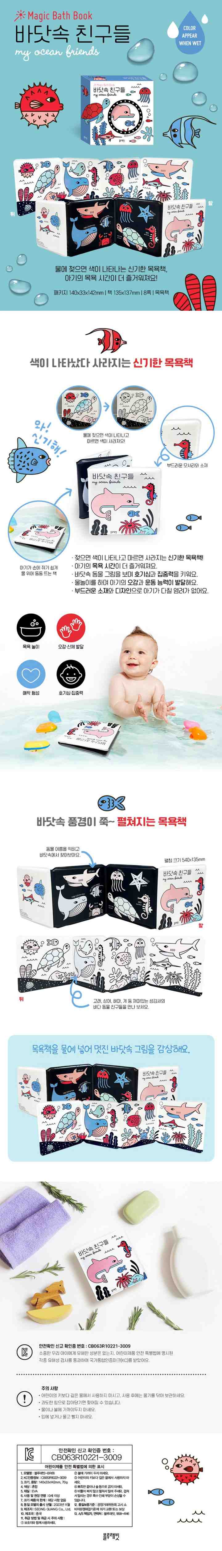 〈매직 바스북 바닷속 친구들〉은 아기가 물과 친해지도록 돕고 호기심과 집중력을 자극해 목욕 시간을 더 즐겁게 만들어 줍니다. 물기 없이 마른 상태에선 선명한 흑백 그림이지만 물에 담그면 알록달록한 색이 나타나, 아기에게 재미를 주지요. 물기가 마르면 색이 사라지고 흑백의 그림으로 되돌아갑니다.