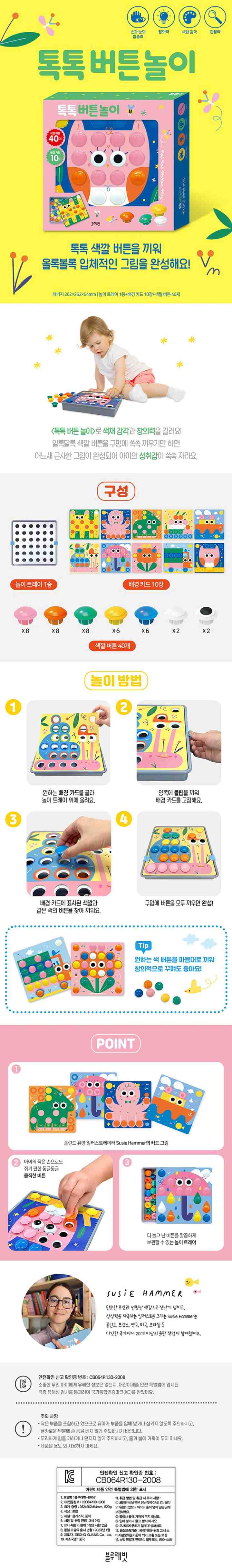 〈톡톡 버튼 놀이〉는 소중한 우리 아이에게 유해한 성분은 없는지, 어린이제품안전 특별법에 명시된 각종 유해성 검사를 통과하여 국가통합인증마크(KC)를 받았어요. 안전성이 검증된 제품으로 아이와 함께 즐겁게 놀이하세요.