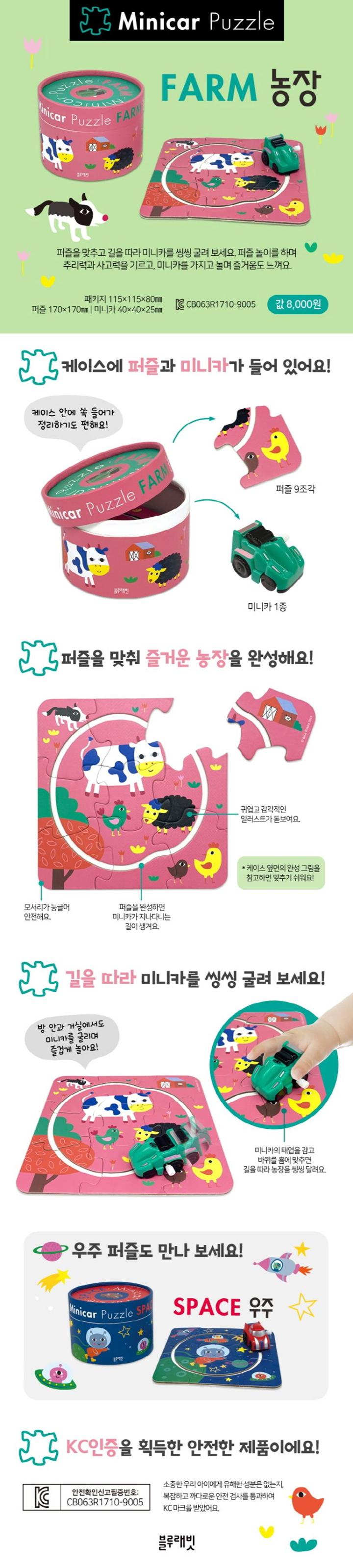 각각의 퍼즐 조각에는 홈이 나 있어요. 퍼즐을 모두 맞추면 미니카가 지나갈 수 있는 길이 완성되지요. 미니카의 태엽을 감고 바퀴를 홈에 맞추면, 길을 따라 농장을 씽씽 달리는 모습을 볼 수 있어요. 퍼즐판 외에도 방 안과 거실 등에서 미니카를 굴리며 즐겁게 놀아 보세요!