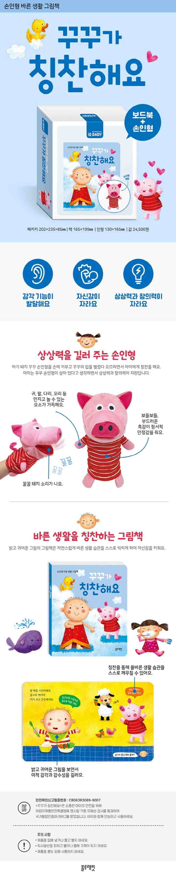 아기 돼지가 칭찬을 듬뿍해 준답니다. 아이는 손인형 꾸꾸의 격려를 받으면 더욱 힘이 내서 바른 습관을 기르는 데 큰 도움이 될 거예요.