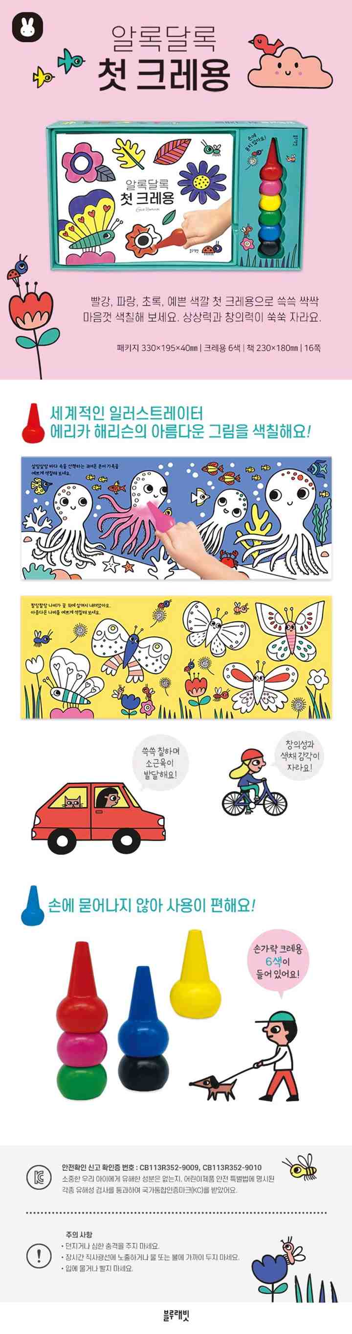 〈알록달록 첫 크레용〉은 소중한 우리 아이에게 유해한 성분은 없는지, 복잡하고 까다로운 안전 검사를 통과하여 국가통합인증마크(KC)를 받았어요. 아기와 함께 안심하고 사용하세요.