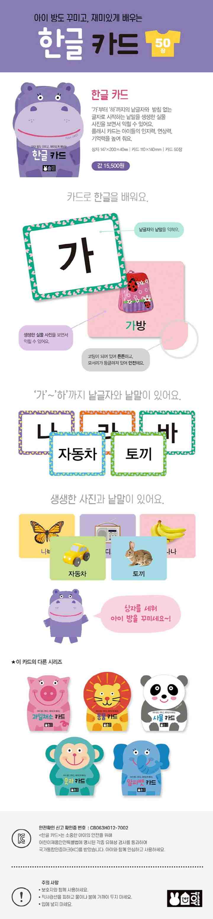 '가' 부터 '하'까지의 낱글자와 받침 없는 글자로 시작하는 낱말로 구성되어 있어요. 카드 뒷면에는 선명하고 생생한 사진이 있어요.