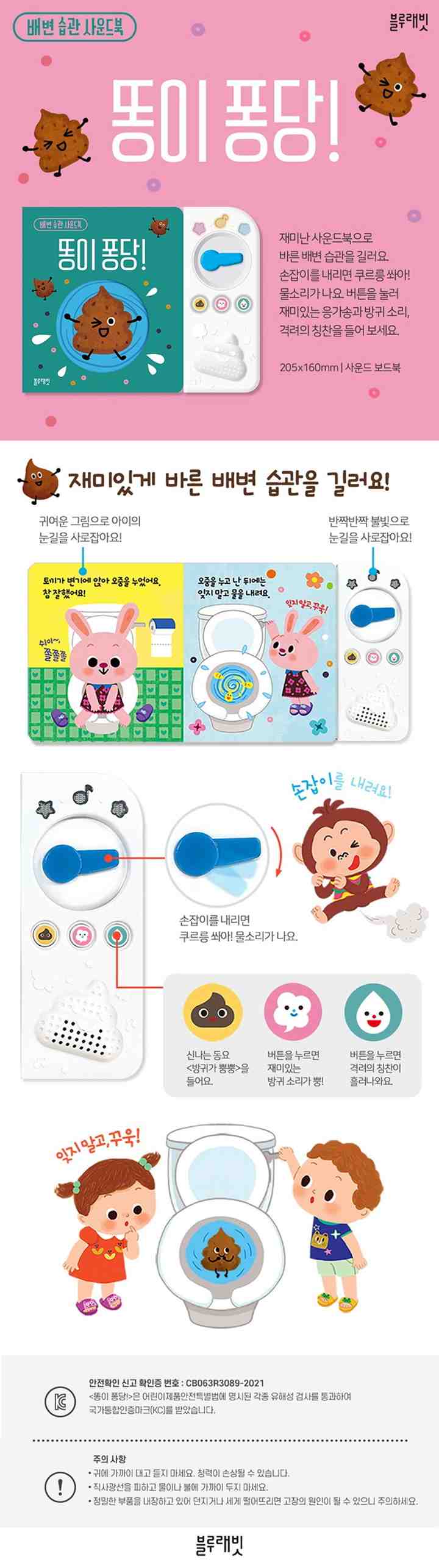 〈똥이 퐁당!〉은 어린이제품안전특별법에 명시된 각종 유해성 검사를 통과하여 국가통합인증마크(KC)를 받았습니다.