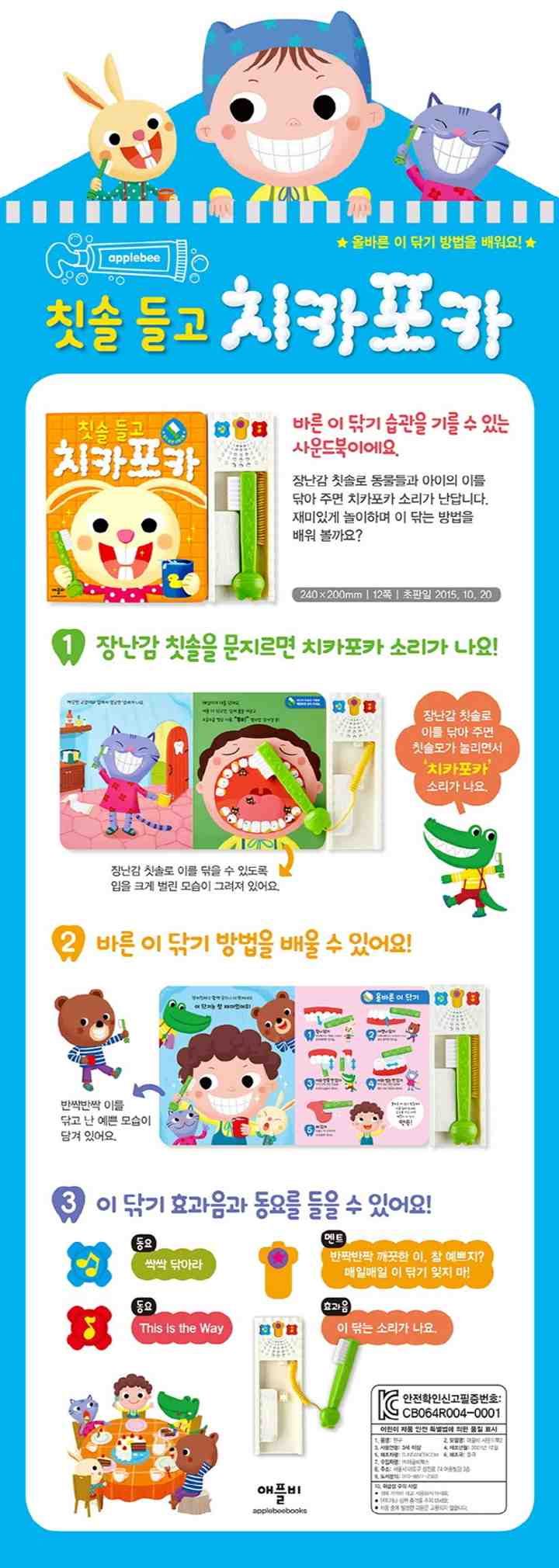 장난감 칫솔로 그림 속 친구들의 이를 문지르면 장난감 칫솔의 칫솔모가 눌리면서 ‘치카포카’ 이 닦는 효과음이 나고, 책장을 넘기면 반짝반짝 깨끗해진 이를 볼 수 있어요. 바른 이 닦기 방법에 대한 설명도 그림과 함께 구성되어 있어 이 닦기 습관을 기르는 데 더욱 좋답니다. ‘칫솔 들고 치카포카’로 재미있게 놀이하면서 양치질은 재미있고 건강을 위한 일이라는 것을 알고, 자연스럽게 양치하는 습관도 길러 보세요.