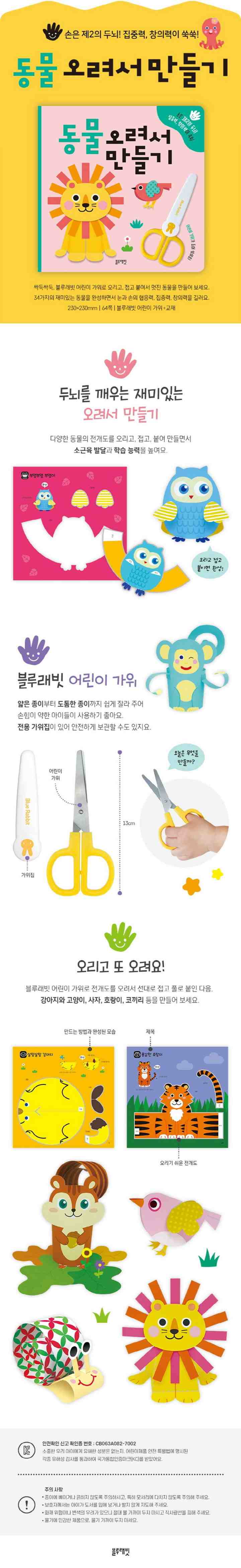 블루래빗 어린이 가위로 전개도를 오려 선대로 접고 풀로 붙여서 토끼와 다람쥐, 호랑이, 사자 등 예쁘고 귀여운 34마리의 동물을 만들어 보세요. 아이들에게 종이를 오리고 풀로 붙여 무언가를 만드는 과정은 집중력과 인내심, 전개도를 이해하는 능력 등 많은 두뇌 활동을 필요로 하기 때문에 그 자체로 의미가 있습니다. 아이가 선을 따라 똑바로 오리지 못하더라도 흥미를 잃지 않고 재미있게 오려서 만들기를 할 수 있도록 격려와 칭찬을 해 준다면, 아이의 두뇌 발달과 정서 발달에 긍정적인 도움이 될 것입니다.