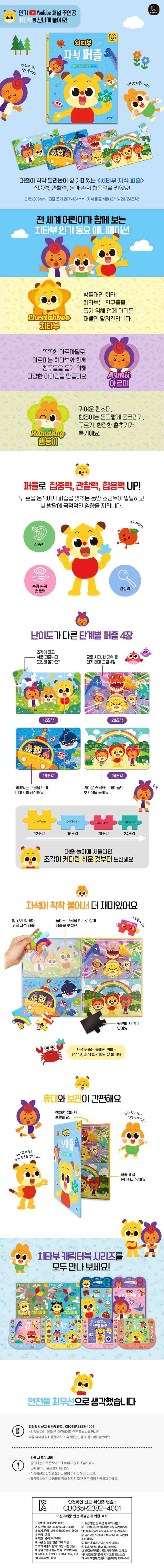 두 손을 움직여서 알맞은 조각을 찾아 맞추고 그림을 완성하는 퍼즐 놀이는 아이의 뇌 발달에 긍정적인 영향을 끼치는 좋은 놀잇감입니다. 아이가 완성하는 기쁨과 성취감을 경험하면서 자연스럽게 관찰력과 집중력을 키워 주지요. 또 알록달록한 색감의 유쾌한 캐릭터 치타부와 친구들이 아이의 눈길을 사로잡고 호기심과 도전할 용기를 줄 것입니다.