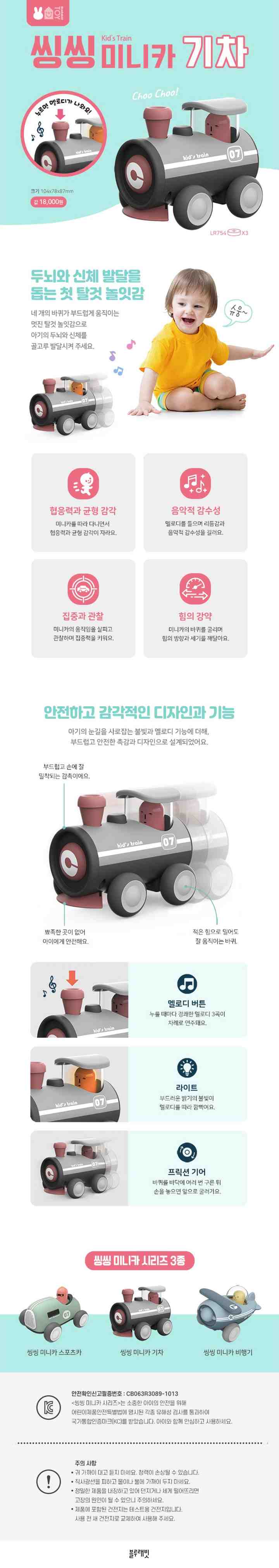 〈씽씽 미니카〉는 멜로디 버튼을 누르는 즉시 신나는 멜로디가 흘러나오고 불빛이 반짝이며 아이의 시선을 사로잡아요. 〈씽씽 미니카 기차〉는 표면이 부드럽고 손에 밀착되는 촉감과 뾰족한 곳이 없는 안전한 디자인으로 설계되었습니다. 기다란 기차 몸통과 투명한 창이 있는 조종석 등 기차 형태의 특징이 잘 살아 있지요. 바퀴에 프릭션 기어가 장착되어, 씽씽 소리가 나도록 바퀴를 바닥에 여러 번 구른 뒤에 손을 놓으면 앞으로 쭉 달려나가요. 부드럽고 안정감 있게 움직이므로 조작이 미숙한 아이도 쉽고 재미있게 놀 수 있어요.
