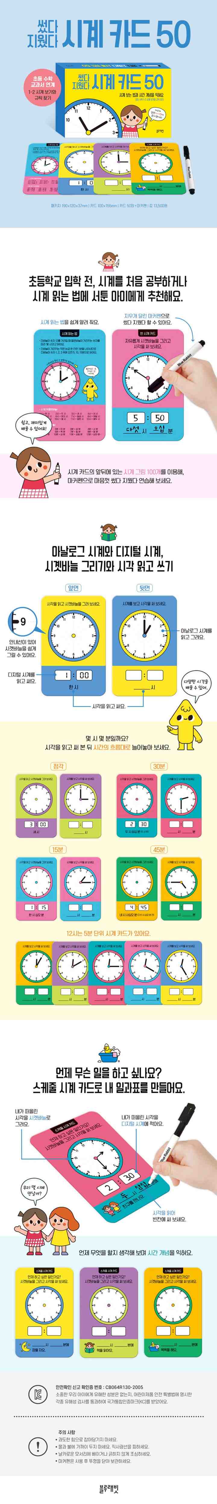 카드에 썼다 지웠다 할 수 있는 마커펜이 들어 있어요. 마음껏 여러 번 써 보며 연습해 보세요. 시계 카드에 시곗바늘을 그리거나 시각을 읽고 쓰며 반복해서 연습하기에 좋아요.