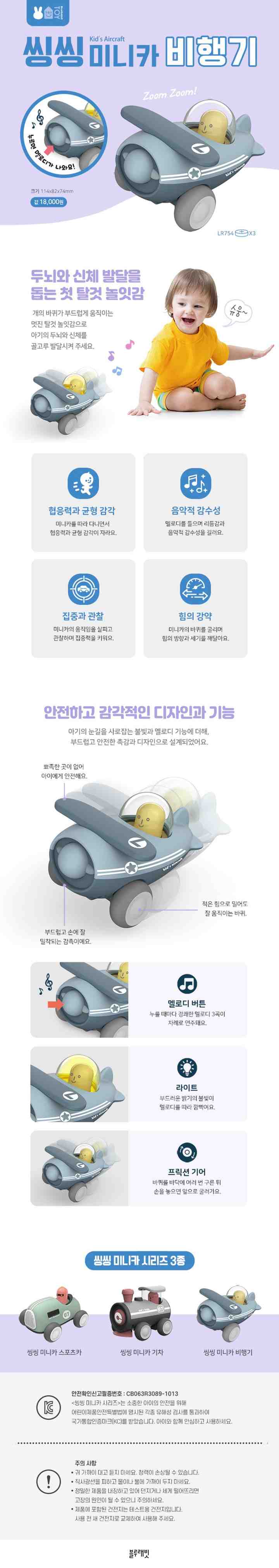 〈씽씽 미니카〉는 멜로디 버튼을 누르는 즉시 신나는 멜로디가 흘러나오고 불빛이 반짝이며 아이의 시선을 사로잡아요. 〈씽씽 미니카 비행기〉는 표면이 부드럽고 손에 밀착되는 촉감과 뾰족한 곳이 없는 안전한 디자인으로 설계되었습니다. 세 개의 바퀴와 날개 등 비행기 형태의 특징이 잘 살아 있지요. 바퀴에 프릭션 기어가 장착되어, 씽씽 소리가 나도록 바퀴를 바닥에 여러 번 구른 뒤에 손을 놓으면 앞으로 쭉 달려나가요. 부드럽고 안정감 있게 움직이므로 조작이 미숙한 아이도 쉽고 재미있게 놀 수 있어요.