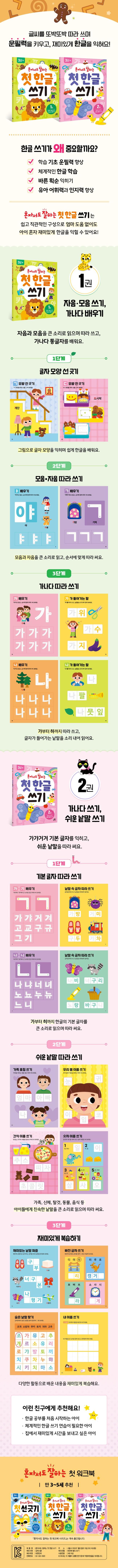 혼자서도 잘하는 첫 워크북 시리즈는 직관적이고 쉬운 구성으로 아이 혼자서도 놀이하듯 쉽게 시작할 수 있다. 기초 운필력을 키워주는 선 긋기부터 한글 쓰기, 숫자 쓰기, 알파벳 쓰기 등 유아 필수 과목들을 체계적으로 구성했다.
