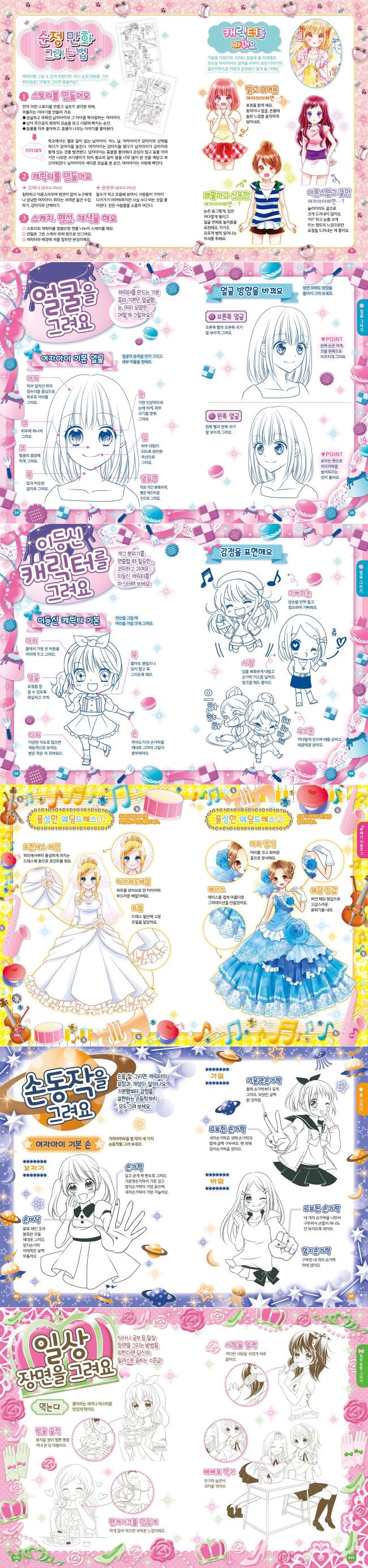 『순정 만화 일러스트 백과』는 430개 이상의 귀엽고 깜찍한 일러스트를 따라 그리며, 순정 만화를 그리는 포인트를 담은 책입니다. 콕콕 짚어 주는 포인트를 따라 그리면 내 그림 솜씨가 쑥쑥 늘어요. 얼굴, 눈, 머리 모양 등 여자아이 캐릭터의 다양한 얼굴형과 풍부한 표정을 따라 그리며 연습해 보세요. 손동작과 몸동작으로 캐릭터의 성격이나 감정을 더 섬세하게 표현할 수 있는 방법이 무엇인지도 알려 줍니다. 캐릭터의 기분과 분위기를 컬러로 표현할 수 있도록 상황별 채색 테크닉을 소개해 두었어요. 주제별 일러스트가 풍성하게 실린 패션 카탈로그를 찾아보며 마음껏 응용해 보고 개성 있는 나만의 캐릭터 만들기에 도전할 수 있어요.