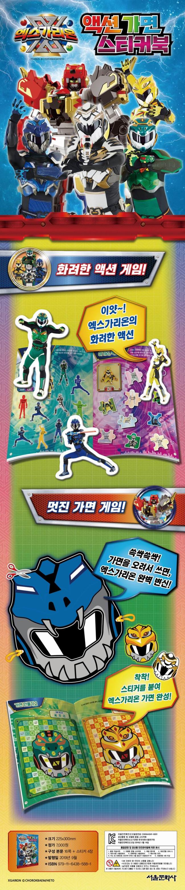 <엑스가리온 액션 가면 스티커북>에서 화려한 액션을 펼치는 엑스가리온 전사들을 만나 보세요. 195개의 다양한 스티커를 붙이며 엑스가리온의 모습을 완성하고, 최강 합체 로봇과 합체 무기도 만들어 보세요. 또 ‘가면 만들기 게임’을 통해, 여러분도 멋진 엑스가리온으로 완벽 변신할 수 있답니다!