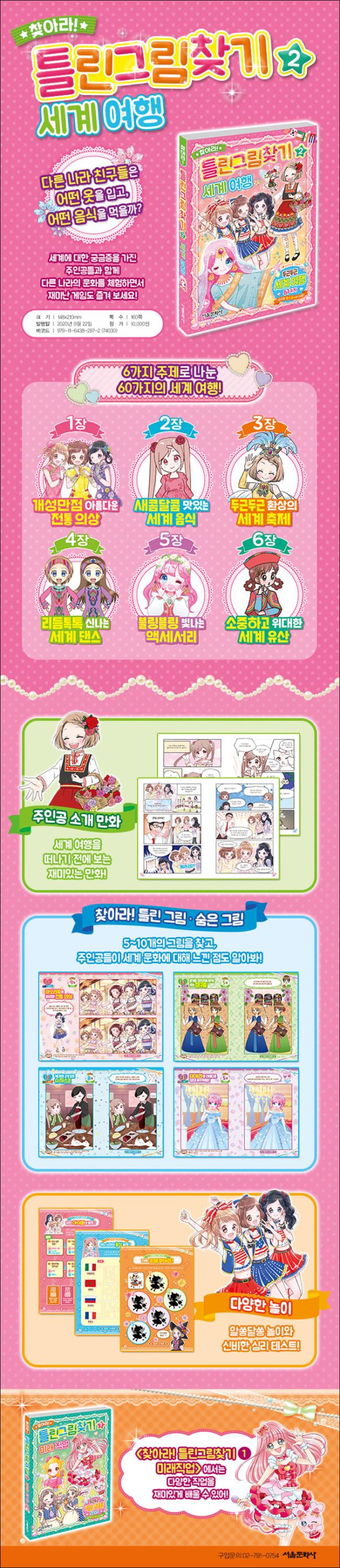<찾아라! 틀린그림찾기 2 세계 여행>에서는 전통 의상, 음식, 축제, 댄스, 액세서리, 문화유산이라는 6가지의 주제로 세계를 여행할 거예요.
